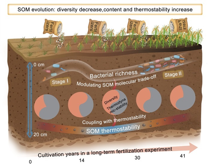 针对上述科学问题,研究团队借助中国科学院鹰潭红壤生态实验站30多年的稻田长期定位试验和黑龙江省农业科学院40多年的黑土长期定位试验的不同施肥处理的时间序列土壤样本,结合热重分析、傅里叶变换离子回旋共振质谱(FT-ICR-MS)与微生物高通量测序技术,发现SOM分子热力学稳定性与整体热稳定性之间具有协同变化关系,而SOM分子热稳定性与分子多样性之间则存在权衡关系。进一步分析表明SOM分子多样性与分子稳定性之间的权衡关系是由细菌多样性驱动的,说明细菌群落可以通过选择性的转化SOM分子,改变SOM分子的能量状态,最终影响SOM的形成和稳定。基于上述结果,研究团队提出了农田SOM分子特征和热稳定性的时间演替模式图,强调了细菌多样性驱动下SOM分子多样性降低而稳定性增加的时间演变特征,并且该过程与SOM整体热稳定性提升和SOM含量增加的过程相吻合。该研究首次揭示了细菌多样性在调节SOM分子多样性与热力学稳定性之间长期权衡中的关键作用,为理解农田SOM形成与稳定机制提供了分子层面的证据,也为未来如何通过调控细菌多样性提高SOM稳定性进而实现农田长期碳固存提供了科学借鉴。